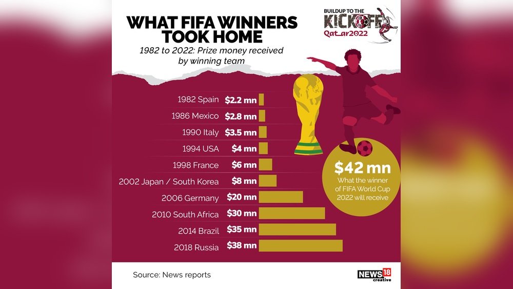 The 2010 World Cup winner earned $30 million. In 2014, this increased to $35 million. The 2018 champion took home $38 million. By 2022, the prize reached $42 million.